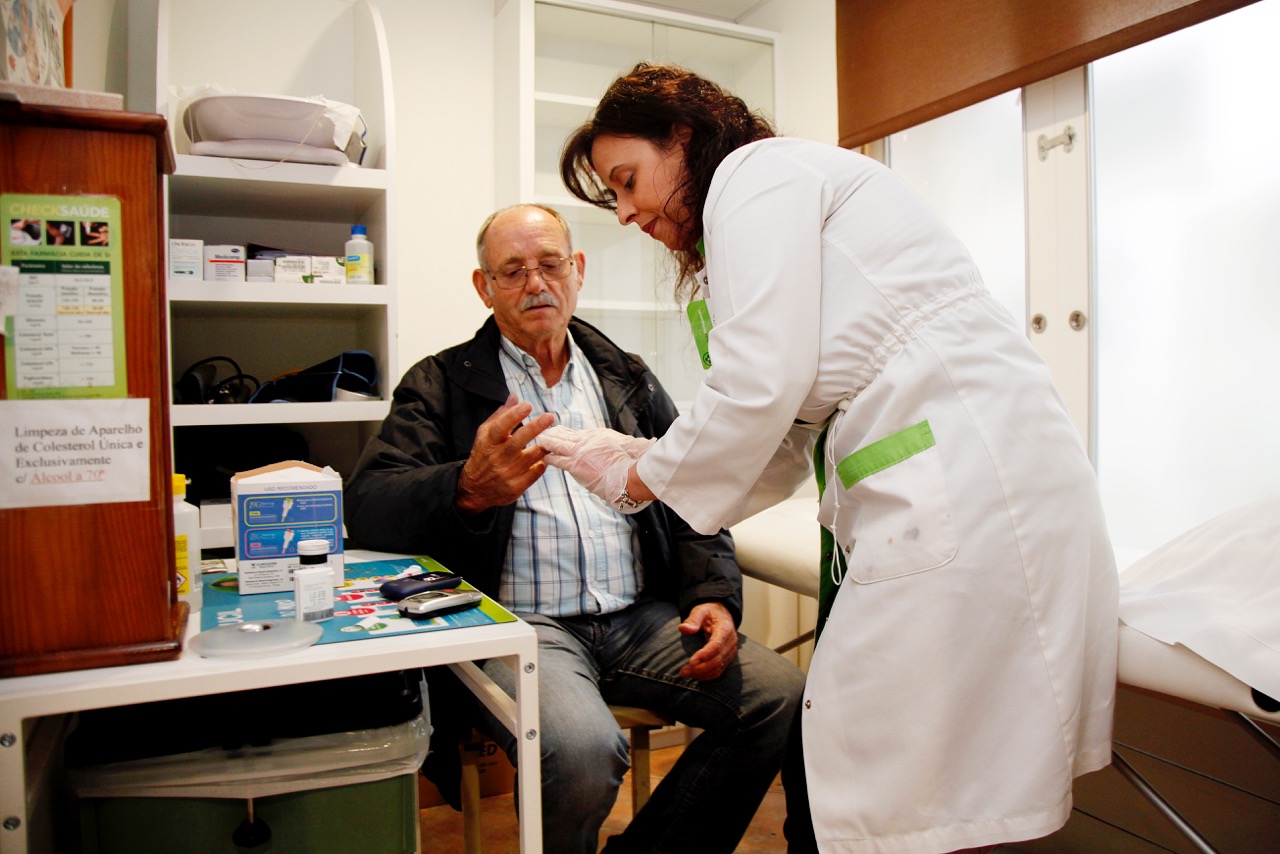 Sandra Presódio faz os testes do colesterol e da glicemia ao utente António Félix